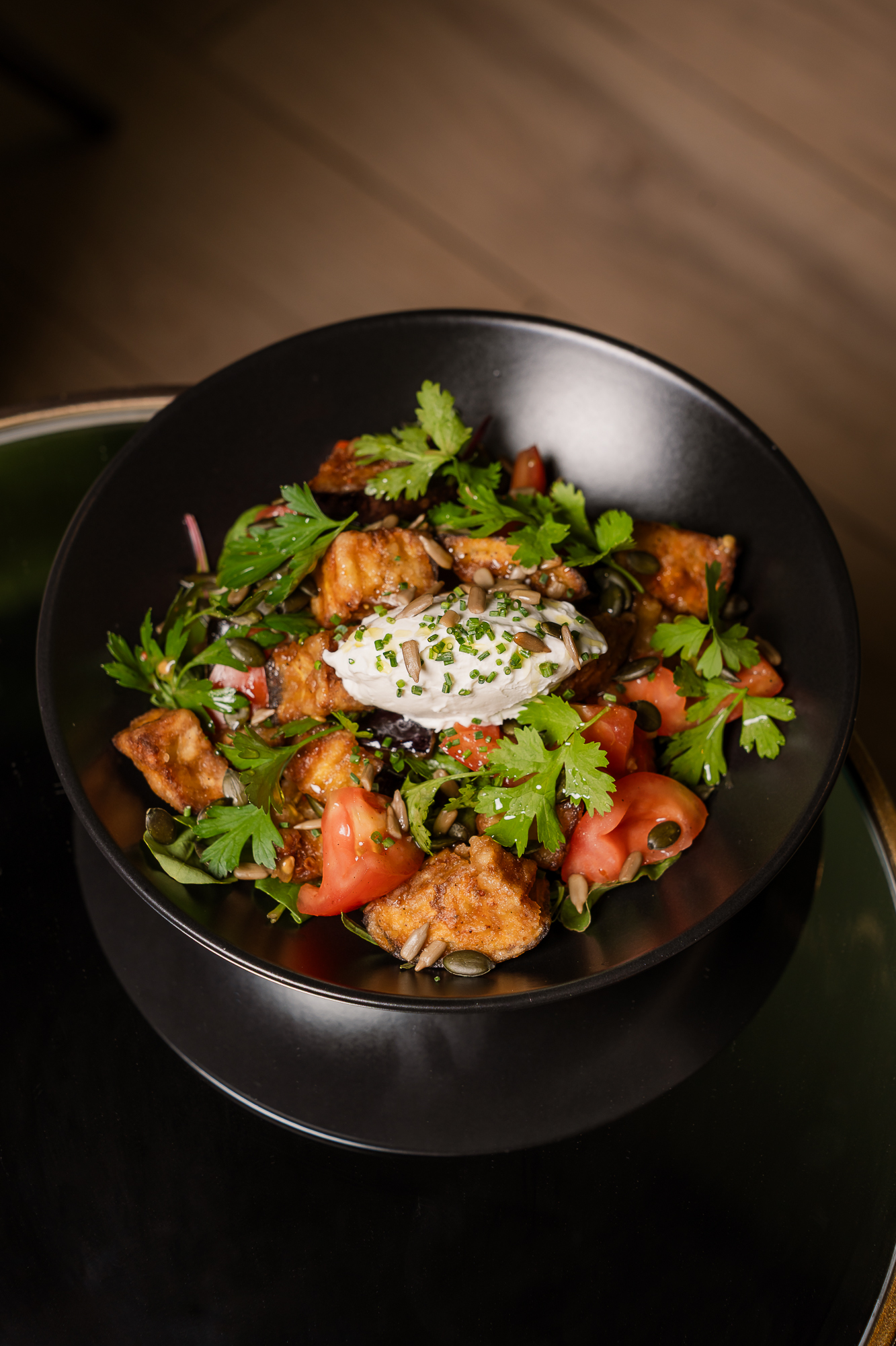 Berenjena crujiente, tomates maduros de temporada, cebolla roja encurtida, hierbas frescas y queso Philadelphia
