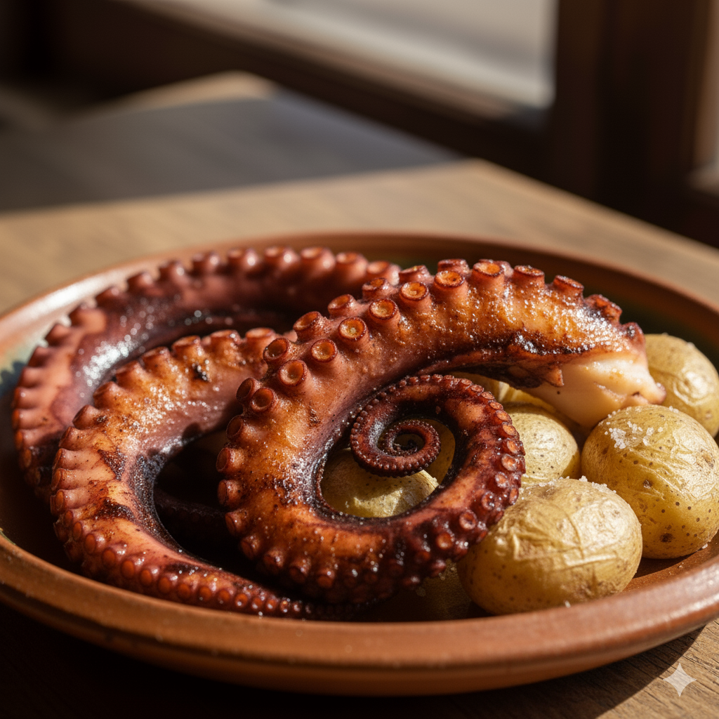 Pulpo con papas arrugadas y salsa de pimiento rojo