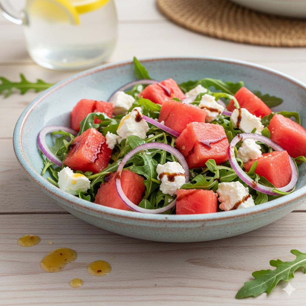 Ensalada ligera con rúcula, cebolla roja, queso feta, sandía de temporada y aderezo de cítricos con balsámico