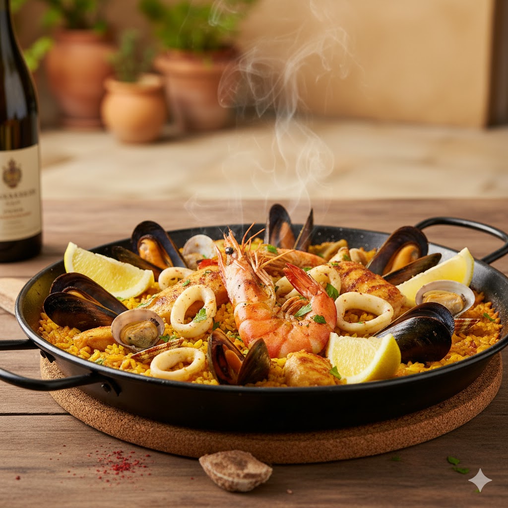 Paella española tradicional con mezcla de mariscos, pescado y pollo según receta tradicional